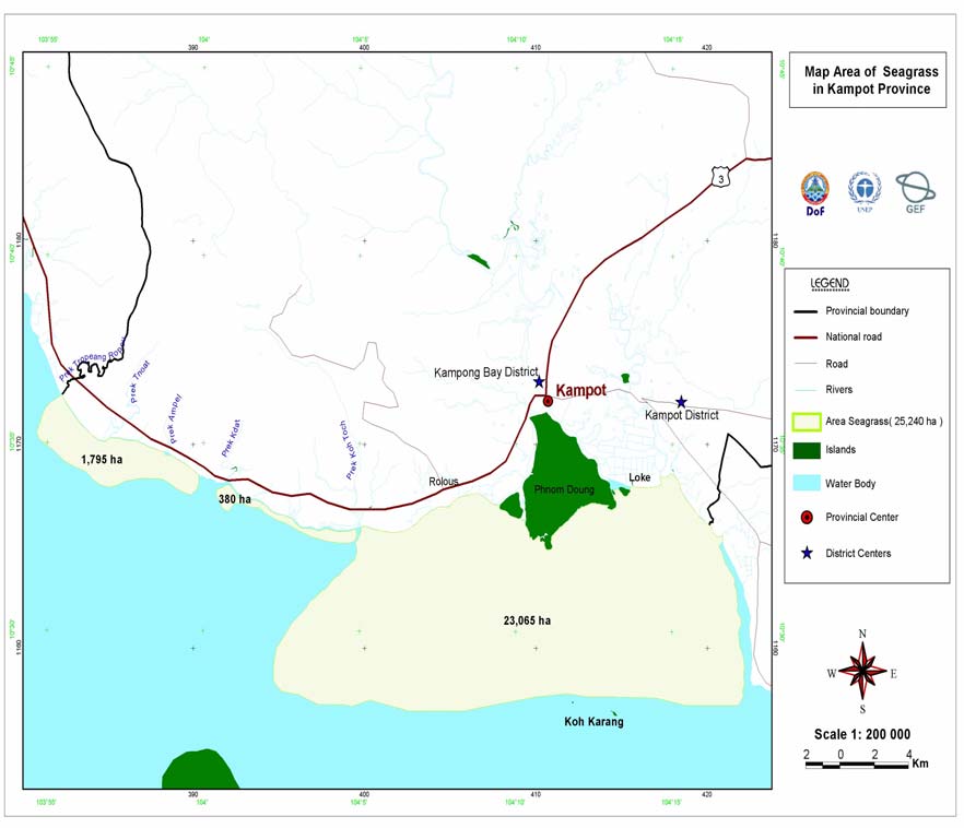 The seagrass meadows are located in parallel to the coastline of Prek Ampil, which extends 150-