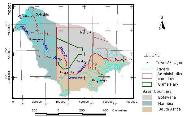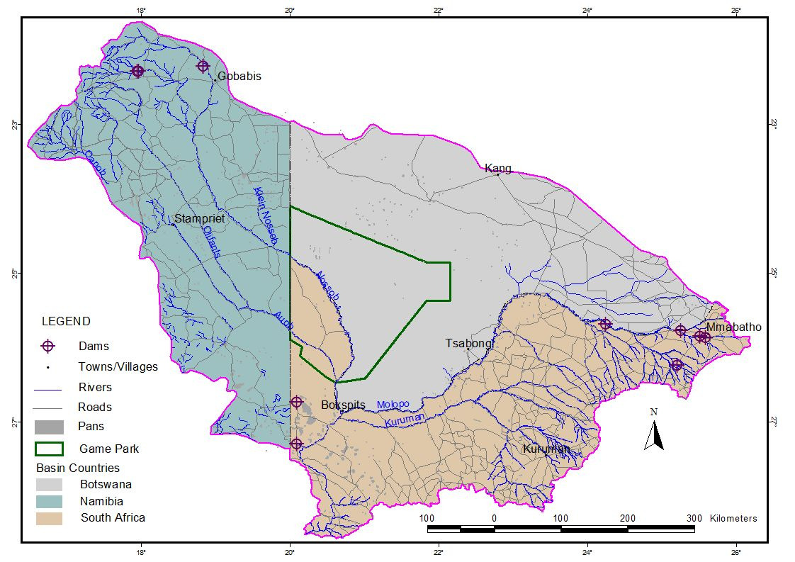 catchment. Of the basin, Botswana covers 37%, Namibia 33% and South Africa 30%. The