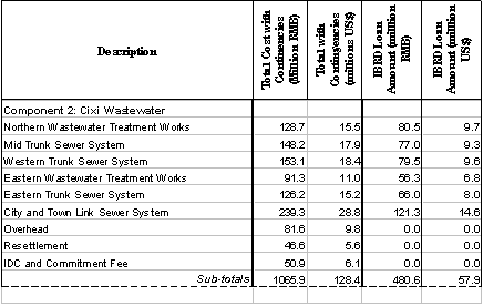 [7] The total cost of the Cixi Wastewater project is $134.4 calculated as $128.4 million (total cost of component under NWEP) minus $1.1 million (estimate of conventional tertiary treatment in NWEP) plus $7.12 million (cost of constructed wetland at North Wastewater Treatment Plant in GEF-NWEP).