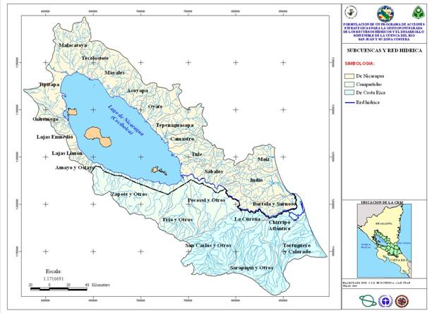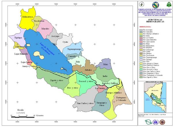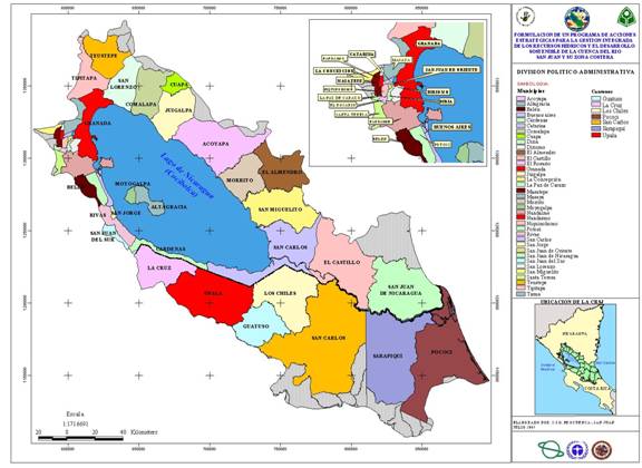 [1] Pertenecientes al Dpto. de Río San Juan en su totalidad, y territorios de los departamentos de Masaya, Granada, Boaco, Chontales, Rivas y la parte sur de la Región Autónoma del Atlántico Sur (RAAS). En Costa Rica los cantones que conforman la cuenca en el área programa son: La Cruz, Upala, Guatusos, Los Chiles, San Carlos, Sarapiquí y Pococí y escasamente los cantones de Alajuela, Coronado, Heredia, Moravia, Naranjo, Oreamundo, Paraíso, Póas, San Ramón, Turrialba, y Vega