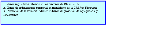 c3.1. Modulo Costa Rica-Nicaragua del Programa de Desarrollo de Zonas Fronterizas en América Central (UE-BCIE). Los objetivos de este Programa asociado son contribuir a: i) mejorar la calidad de vida de las poblaciones de los municipios fronterizos centroamericanos, mediante acciones tendientes a reducir la pobreza y la vulnerabilidad y a fortalecer las capacidades de gestión y de participación social; ii) mejorar la cantidad y calidad del agua en las cuencas compartidas, evitando con ello la afloración de posibles conflictos internacionales en su uso y protección; iii) fortalecer el proceso de integración centroamericano. El programa se orienta a consolidar, en las microregiones, la capacidad técnica, administrativa y de iniciativa de gestión de los siguientes actores locales: