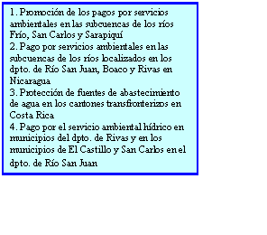 · El aporte asociado, con financiamiento aprobado para el Programa de Desarrollo Fronterizo Costa Rica-Nicaragua identificado durante la preparación del PAE destinado al Fortalecimiento de las Iniciativas de Corredores Biológicos entre Nicaragua y Costa Rica y la propuesta de creación en San Carlos de Nicaragua del Instituto Regional Centroamericano del Agua para la Gestión Integrada de los Recursos Hídricos, en San Carlos, Nicaragua (en gestión).