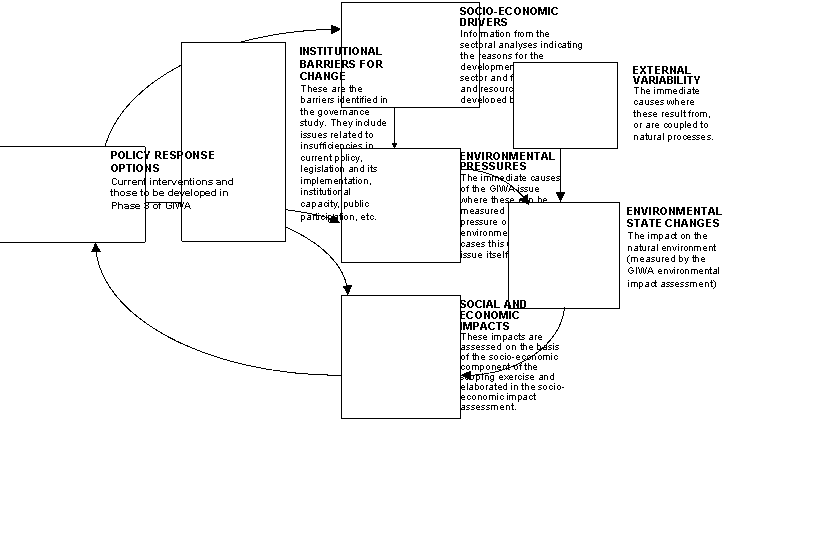 A methodology for conducting exercises such as those described above has been developed for the Global International Waters Assessment (GIWA) by the University of Plymouth, UK[1]. The Global International Waters Assessment is a UNEP funded project (GF/FP/1100-99-01) which aims to produce a comprehensive and integrated strategic assessment, encompassing the ecological status and causes of environmental issues in transboundary freshwater basins and their associated coastal and ocean systems. This integrated assessment will be used by GEF and its partners to identify priorities for remedial and mitigatory actions in international waters. It is being undertaken from the perspective of: water quality and quantity; associated biodiversity and habitats; their use by society; the societal causes of the regionally identified issues; and scenarios of future conditions based on projections of demographic, economic and social changes associated with the process of human development. The GIWA methodology: