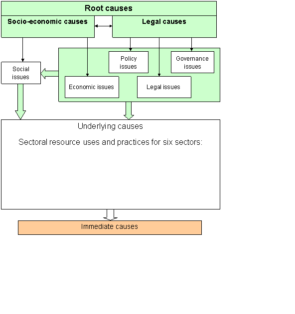 The final step in the methodology is a simple analysis of underlying or root causes. Existing and/or emerging transboundary environmental issues can be attributed to a range of socio-economic and legal root causes. The Socio-economic root causes themselves represent social and economic issues whereas the Legal root causes are associated with policy, legal and governance issues. Economic, political, legal and governance issues constitute a suite that in itself is a cause of social issues and underlying sectoral causes, (resource uses and practices).